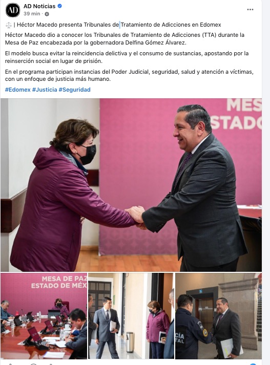 Héctor Macedo dio a conocer los Tribunales de Tratamiento de Adicciones (TTA) durante la Mesa de Paz encabezada por la gobernadora Delfina Gómez Álvarez.