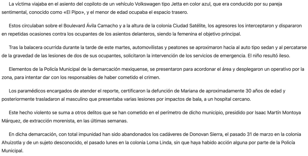 Una mujer identificada como Mariana «N», quien viajaba a bordo de un vehículo, fue ejecutada por sujetos armados, en el municipio de Naucalpan. Su hijo de 5 años fue testigo del hecho.