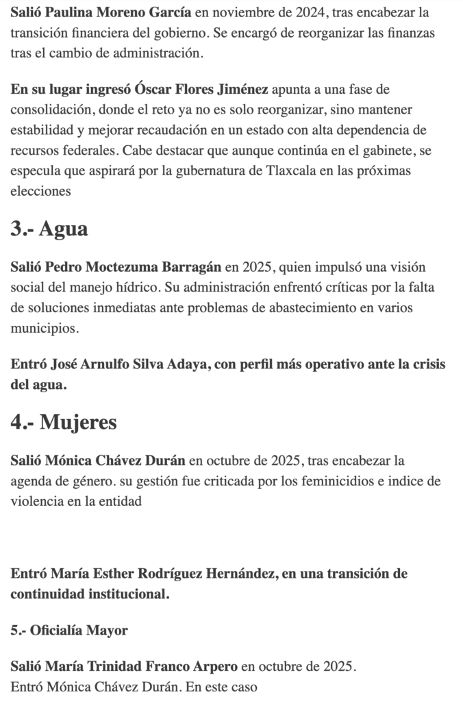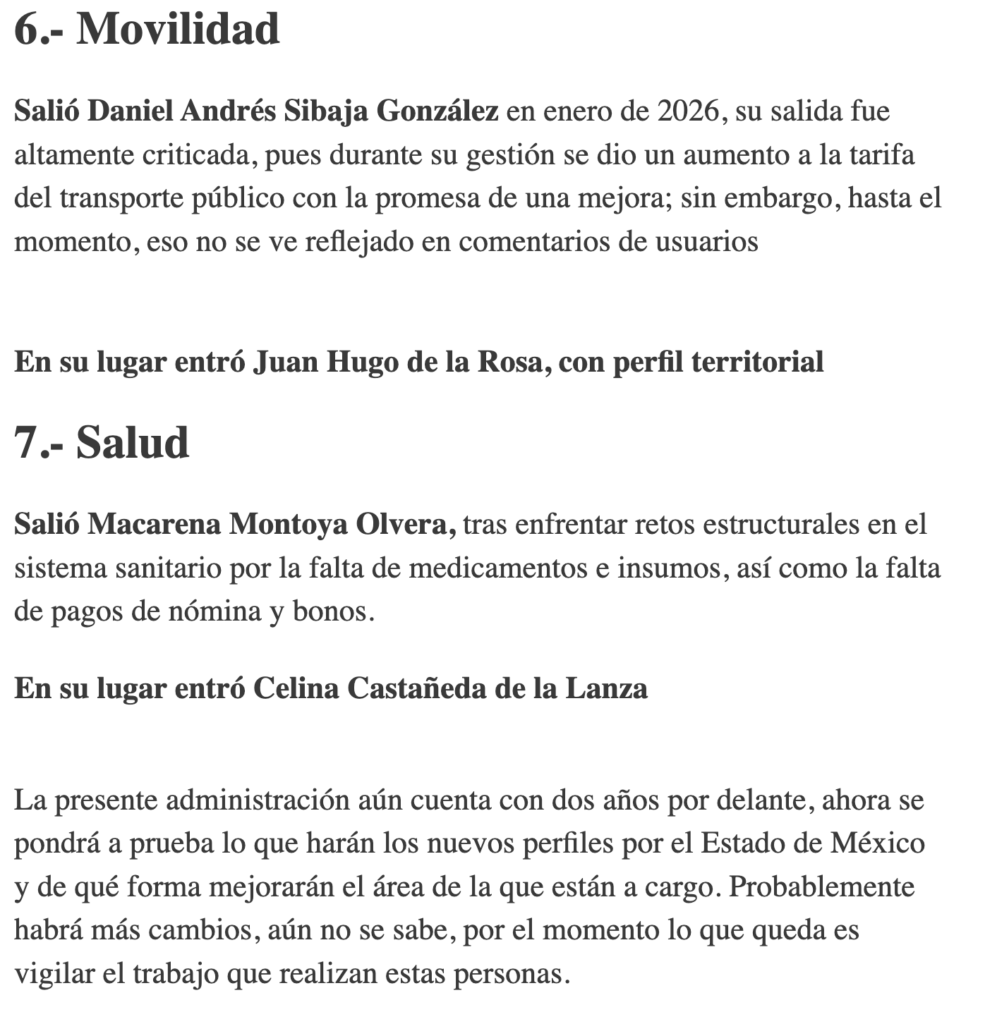 La administración de la Gobernadora Delfina Gomez inició en 2023, hasta el momento suma siete cambios en su gabinete en áreas clave como salud, educación, movilidad, entre otros. La mandataria inició con un equipo, pero hasta ahora, a la mitad de su gestión este ha tenido reacomodos importantes, a continuación se enlistan