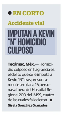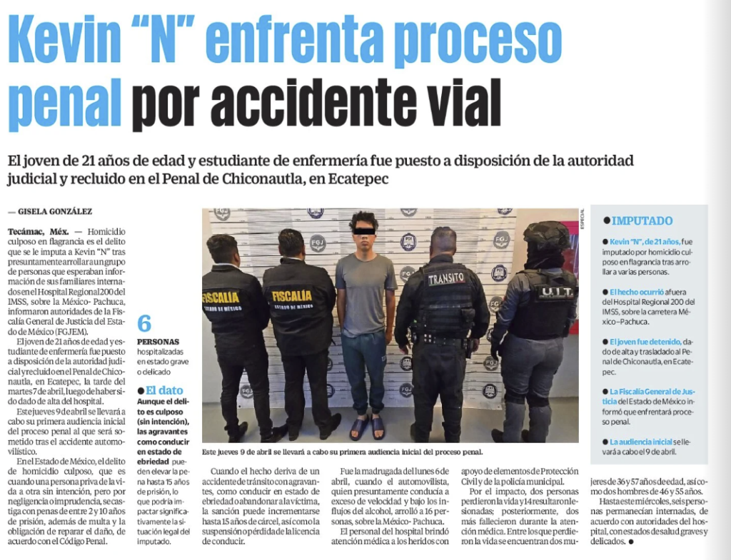 Homicidio culposo en flagrancia es el delito que se le imputa a Kevin “N” tras presuntamente arrollar a un grupo de personas que esperaban información de sus familiares internados en el Hospital Regional 200 del IMSS, sobre la México- Pachuca, informaron autoridades de la Fiscalía General de Justicia del Estado de México (FGJEM).