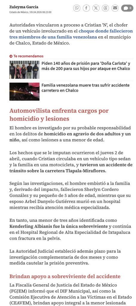 - https://www.milenio.com/policia/procesan-cristian-automovilista-tras-muerte-familia-venezolana-chalco
