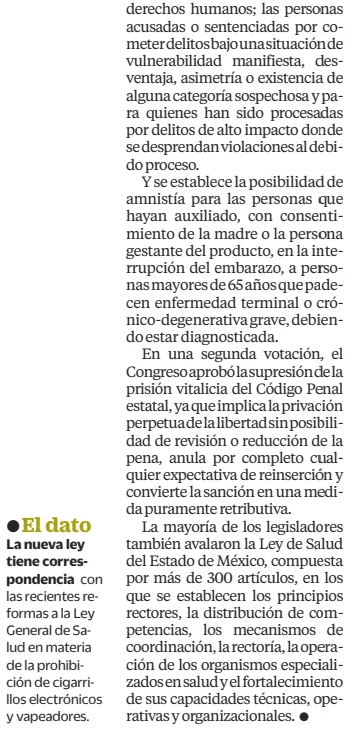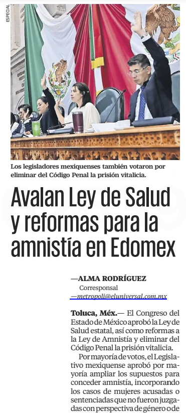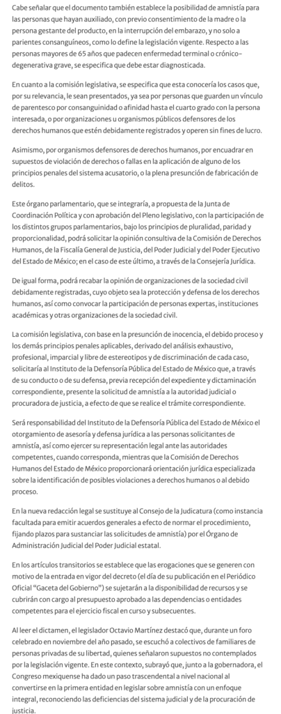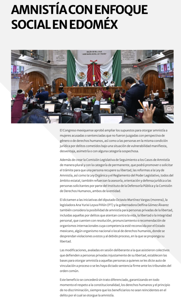El Congreso mexiquense aprobó ampliar los supuestos para otorgar amnistía a mujeres acusadas o sentenciadas que no fueron juzgadas con perspectiva de género o de derechos humanos, así como a las personas en la misma condición jurídica por delitos cometidos bajo una situación de vulnerabilidad manifiesta, desventaja, asimetría o con alguna categoría sospechosa.