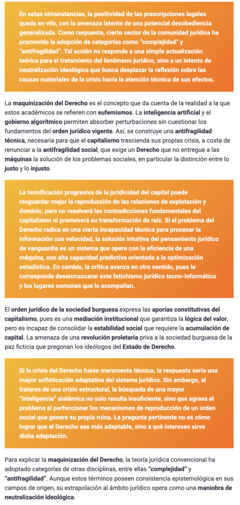 Los sistemas jurídicos contemporáneos enfrentan una crisis estructural, pues las contradicciones constitutivas del capitalismo han rebasado las capacidades públicas de satisfacción de necesidades, gestión de externalidades y contención de conflictos, sin posibilidad de que reformas normativas y ajustes institucionales resuelvan la quiebra interna de la sociedad burguesa.