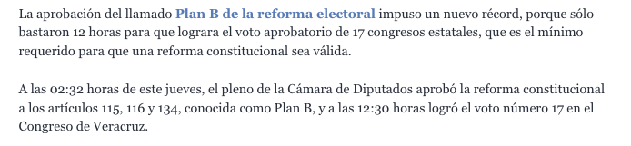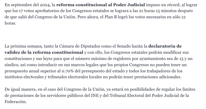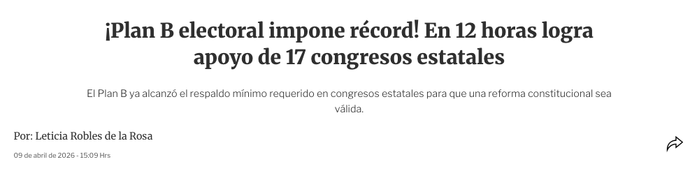 La aprobación del llamado Plan B de la reforma electoral impuso un nuevo récord, porque sólo bastaron 12 horas para que lograra el voto aprobatorio de 17 congresos estatales, que es el mínimo requerido para que una reforma constitucional sea válida.