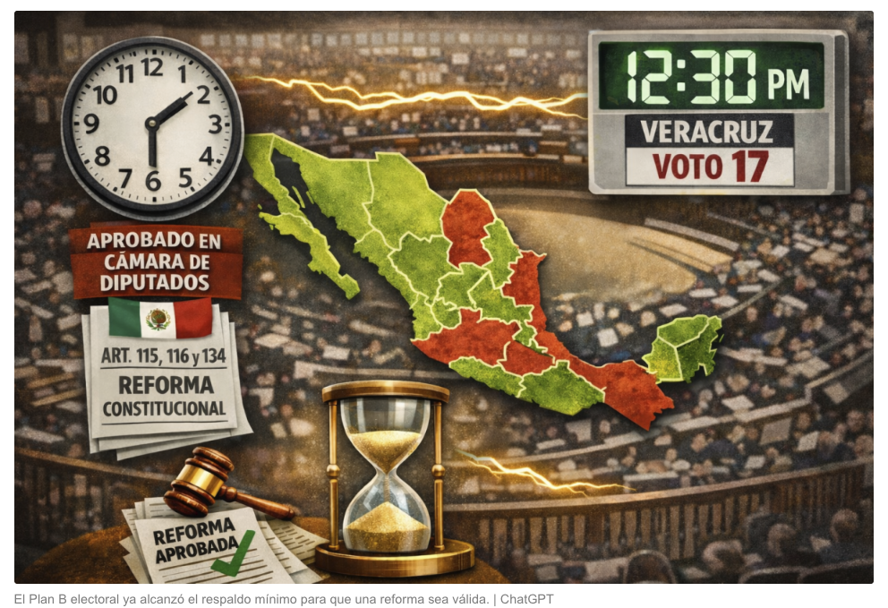 A las 02:32 horas de este jueves, el pleno de la Cámara de Diputados aprobó la reforma constitucional a los artículos 115, 116 y 134, conocida como Plan B, y a las 12:30 horas logró el voto número 17 en el Congreso de Veracruz.