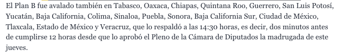 El Plan B fue avalado también en Tabasco, Oaxaca, Chiapas, Quintana Roo, Guerrero, San Luis Potosí, Yucatán, Baja California, Colima, Sinaloa, Puebla, Sonora, Baja California Sur, Ciudad de México, Tlaxcala, Estado de México y Veracruz, que lo respaldó a las 14:30 horas, es decir, dos minutos antes de cumplirse 12 horas desde que lo aprobó el Pleno de la Cámara de Diputados la madrugada de este jueves.