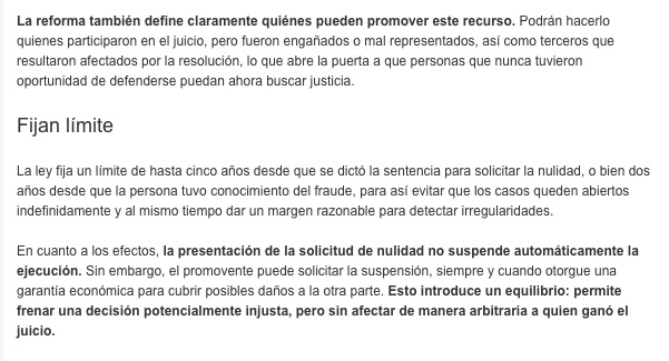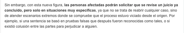 Esta reforma, publicada en la Gaceta del Gobierno, responde a una problemática que durante años generó inconformidad, donde había casos en los que un juicio ya terminado, y aparentemente “legal”, ocultaba prácticas indebidas como documentos falsos, acuerdos entre las partes para engañar o incluso juicios realizados sin que una de las personas afectadas lo supiera. Hasta ahora, esos casos eran muy difíciles de combatir, incluso mediante el amparo.