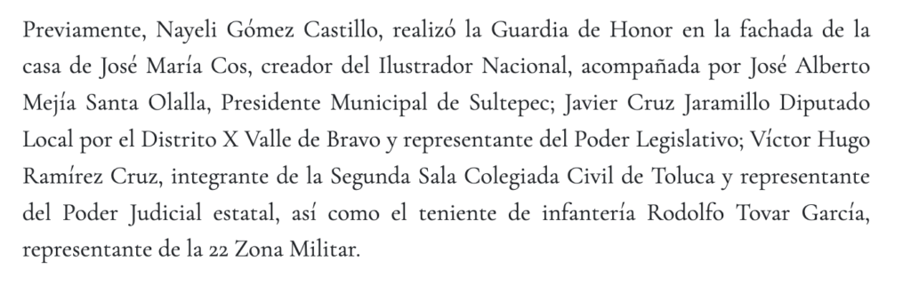 Previamente, Nayeli Gómez Castillo, realizó la Guardia de Honor en la fachada de la casa de José María Cos, creador del Ilustrador Nacional, acompañada por José Alberto Mejía Santa Olalla, Presidente Municipal de Sultepec; Javier Cruz Jaramillo Diputado Local por el Distrito X Valle de Bravo y representante del Poder Legislativo; Víctor Hugo Ramírez Cruz, integrante de la Segunda Sala Colegiada Civil de Toluca y representante del Poder Judicial estatal, así como el teniente de infantería Rodolfo Tovar García, representante de la 22 Zona Militar.