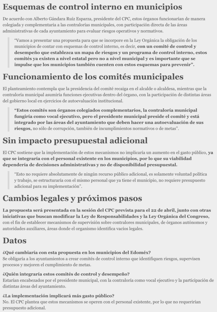 El Comité de Participación Ciudadana del Sistema Anticorrupción del Estado de México prevé presentar ante el Congreso local una propuesta para que los ayuntamientos estén obligados a implementar esquemas de control interno, con el objetivo de fortalecer la prevención de irregularidades administrativas y mejorar el cumplimiento de metas institucionales.