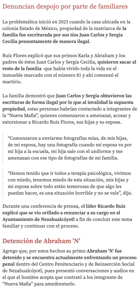 Desde hace meses la familia Ruiz perdió su tranquilidad luego de ser amenazados por un grupo delictivo identificado como “Nueva Mafia” supuestamente dedicados a la extorsión, homicidio y despojo en los municipios de Chimalhuacán y Nezahualcóyotl, en la zona oriente del Estado de México.