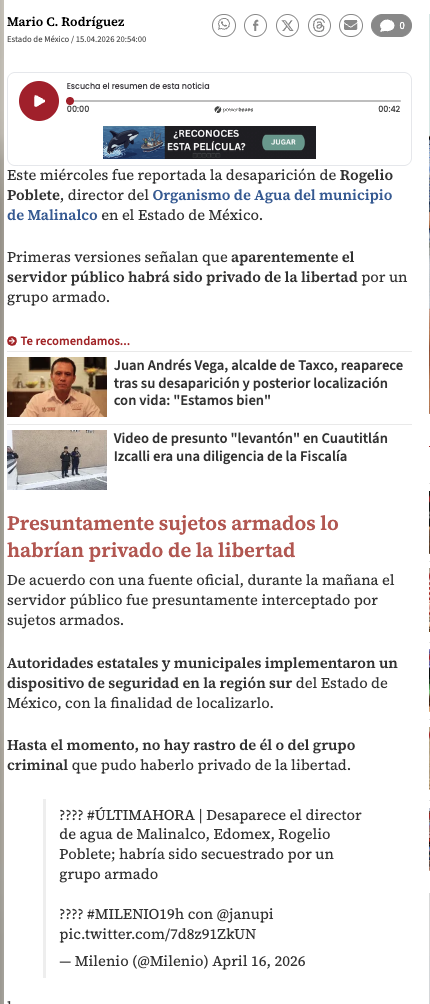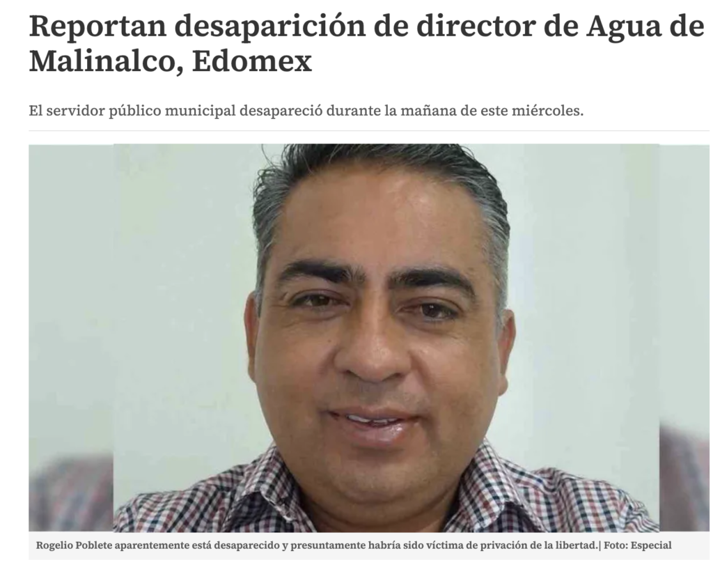 Este miércoles fue reportada la desaparición de Rogelio Poblete, director del Organismo de Agua del municipio de Malinalco en el Estado de México.