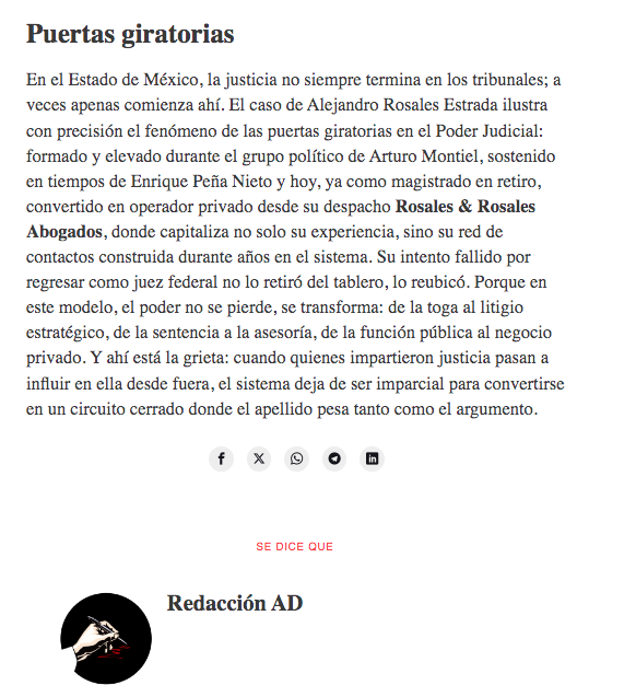 En el Estado de México, la justicia no siempre termina en los tribunales; a veces apenas comienza ahí. El caso de Alejandro Rosales Estrada ilustra con precisión el fenómeno de las puertas giratorias en el Poder Judicial: formado y elevado durante el grupo político de Arturo Montiel, sostenido en tiempos de Enrique Peña Nieto y hoy, ya como magistrado en retiro, convertido en operador privado desde su despacho Rosales & Rosales Abogados, donde capitaliza no solo su experiencia, sino su red de contactos construida durante años en el sistema. Su intento fallido por regresar como juez federal no lo retiró del tablero, lo reubicó. Porque en este modelo, el poder no se pierde, se transforma: de la toga al litigio estratégico, de la sentencia a la asesoría, de la función pública al negocio privado. Y ahí está la grieta: cuando quienes impartieron justicia pasan a influir en ella desde fuera, el sistema deja de ser imparcial para convertirse en un circuito cerrado donde el apellido pesa tanto como el argumento.