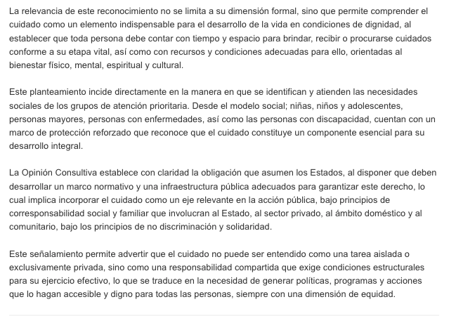 Por supuesto, es una circunstancia que debía ser abordada por los tribunales. De esta forma, la Corte Interamericana de Derechos Humanos, en la Opinión Consultiva No. 31 de 2025, planteada por la nación Argentina en 2023; reconoce el derecho al cuidado como un derecho humano autónomo en la región latinoamericana, dejando de depender exclusivamente del ejercicio de otros derechos y adquiriendo un carácter individual y específico dentro del sistema de derechos humanos.