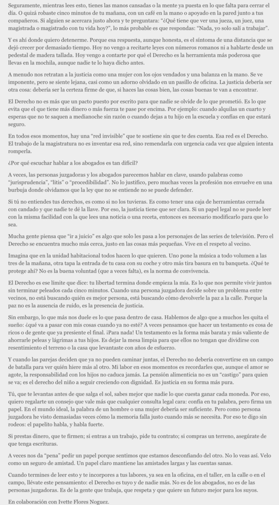 Seguramente, mientras lees esto, tienes las manos cansadas o la mente ya puesta en lo que falta para cerrar el día. O quizá robaste cinco minutos de tu mañana, con un café en la mano o apoyado en la pared junto a tus compañeros. Si alguien se acercara justo ahora y te preguntara: “¿Qué tiene que ver una jueza, un juez, una magistrada o magistrado con tu vida hoy?”, lo más probable es que respondas: “Nada, yo solo salí a trabajar”.