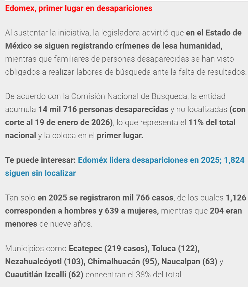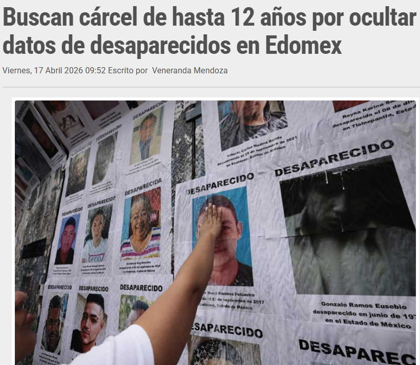 - https://www.trespm.mx/edomex/buscan-carcel-de-hasta-12-anos-por-ocultar-datos-de-desaparecidos-en-edomex