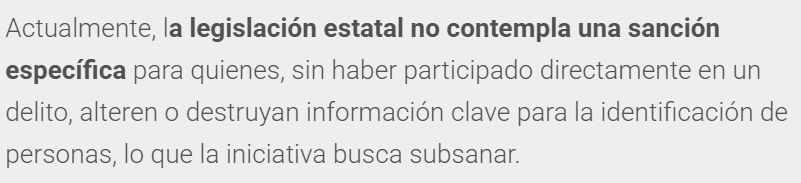 El Partido Acción Nacional (PAN) en el Congreso mexiquense propuso reformar el Código Penal del Estado de México para sancionar con hasta 12 años de prisión el encubrimiento de desaparición de personas, particularmente cuando se alteren, destruyan u oculten datos biométricos o identificativos con el fin de obstaculizar investigaciones.