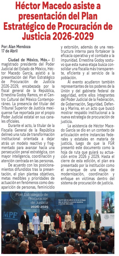 Héctor Macedo asiste a presentación del Plan Estratégico de Procuración de Justicia 2026-2029