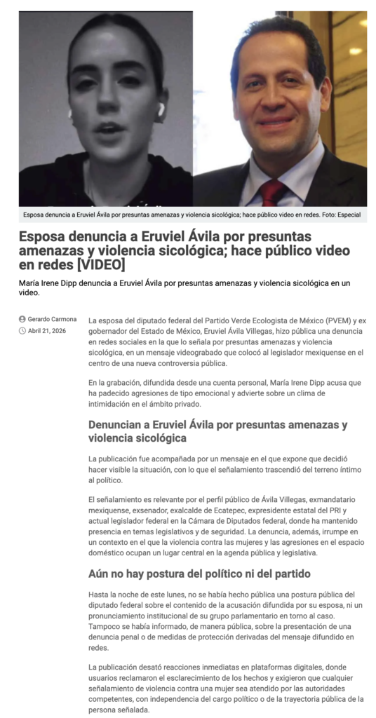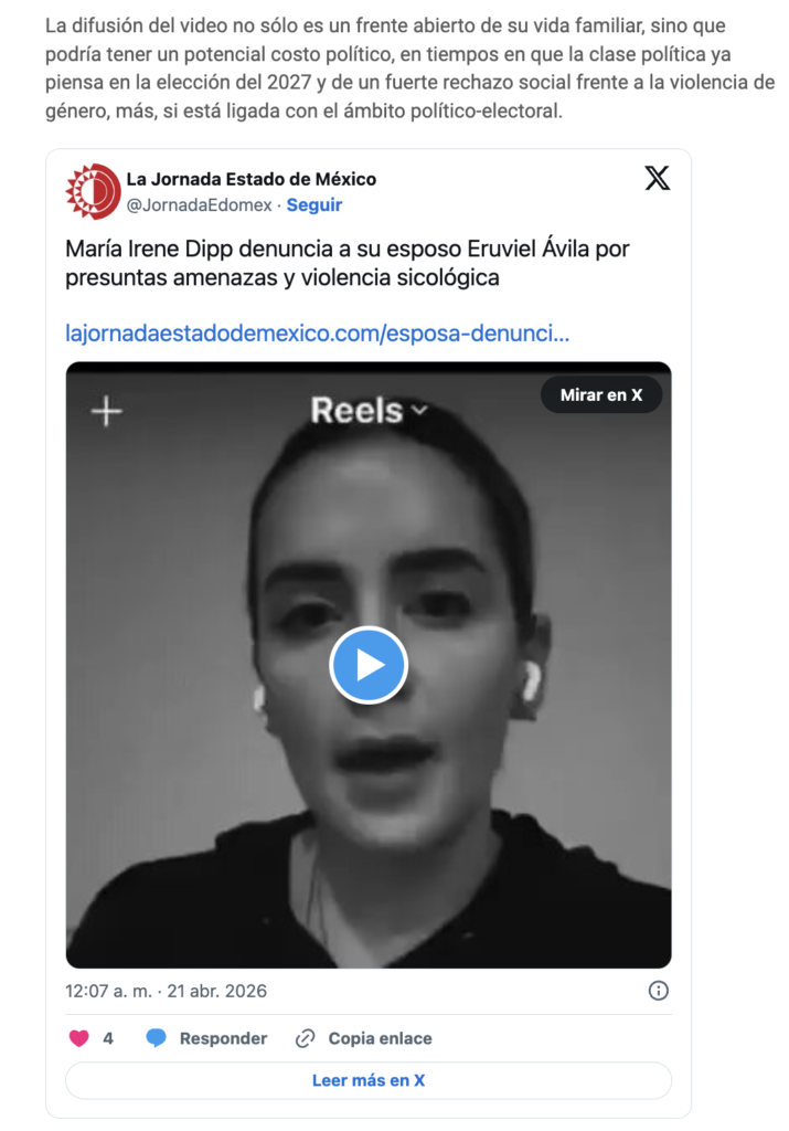 La esposa del diputado federal del Partido Verde Ecologista de México (PVEM) y ex gobernador del Estado de México, Eruviel Ávila Villegas, hizo pública una denuncia en redes sociales en la que lo señala por presuntas amenazas y violencia sicológica, en un mensaje videograbado que colocó al legislador mexiquense en el centro de una nueva controversia pública.