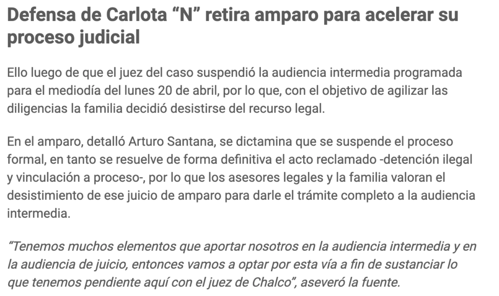 Desistirá Defensa de Carlota “N” de amparo para dar continuidad al juicio