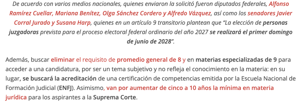 Varios legisladores de Morena entre ellos diputados y senadores enviaron una iniciativa para modificar la elección judicial con el objetivo de atrasarla para el 2028 y así evitar la concurrencia con procesos electorales políticas, a fin de garantizar mayor deliberación pública, proteger la independencia judicial y permitir una organización electora más ordenada y robusta.