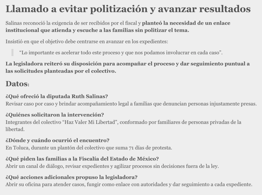 La diputada Ruth Salinas Reyes ofreció revisar caso por caso la situación de personas señaladas como injustamente presas y, de ser necesario, facilitar acompañamiento legal, tras reunirse con integrantes del colectivo “Haz Valer Mi Libertad”, quienes mantienen un plantón que cumple 71 días.