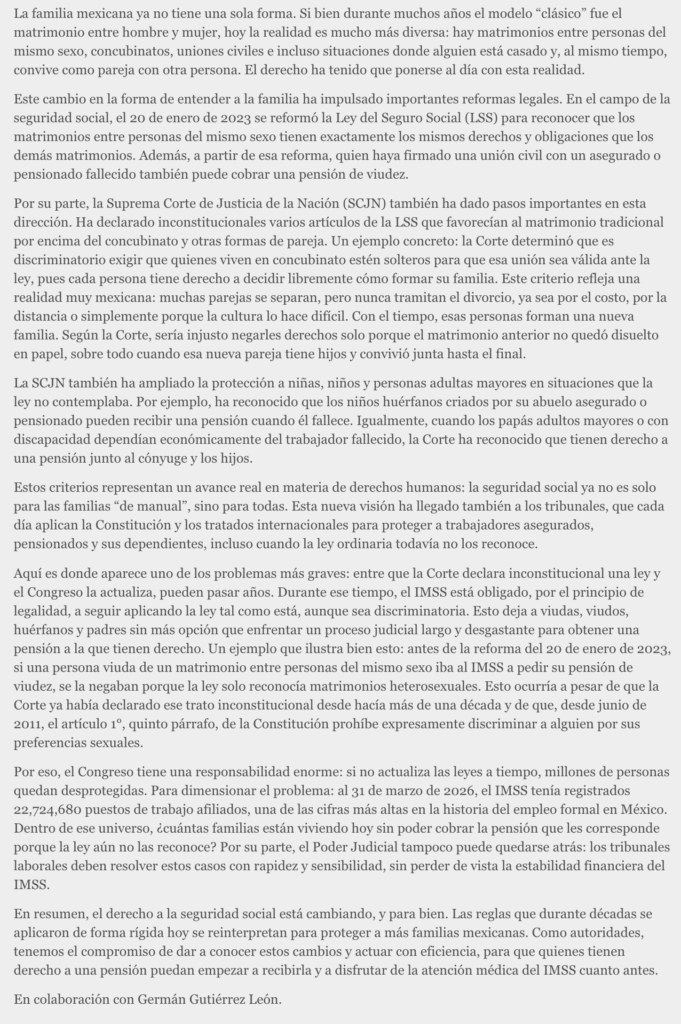 Por eso, el Congreso tiene una responsabilidad enorme: si no actualiza las leyes a tiempo, millones de personas quedan desprotegidas. Para dimensionar el problema: al 31 de marzo de 2026, el IMSS tenía registrados 22,724,680 puestos de trabajo afiliados, una de las cifras más altas en la historia del empleo formal en México. Dentro de ese universo, ¿cuántas familias están viviendo hoy sin poder cobrar la pensión que les corresponde porque la ley aún no las reconoce? Por su parte, el Poder Judicial tampoco puede quedarse atrás: los tribunales laborales deben resolver estos casos con rapidez y sensibilidad, sin perder de vista la estabilidad financiera del IMSS.