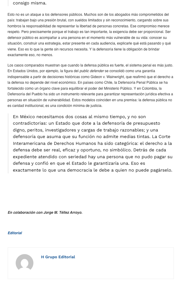 La mayoría de las personas que enfrentan un proceso penal no puede pagar peritos, ni costear un litigante experimentado, ni sostener un juicio largo. Cuando el Estado acusa, esa persona llega sola. Y en ese momento, la defensoría pública deja de ser una opción y se convierte en la única alternativa. De ahí que su papel sea central, constitucional y ético: existe precisamente para que la falta de recursos no equivalga a la pérdida de derechos. Ese es su mandato, y ese mandato exige altura, no conformismo.