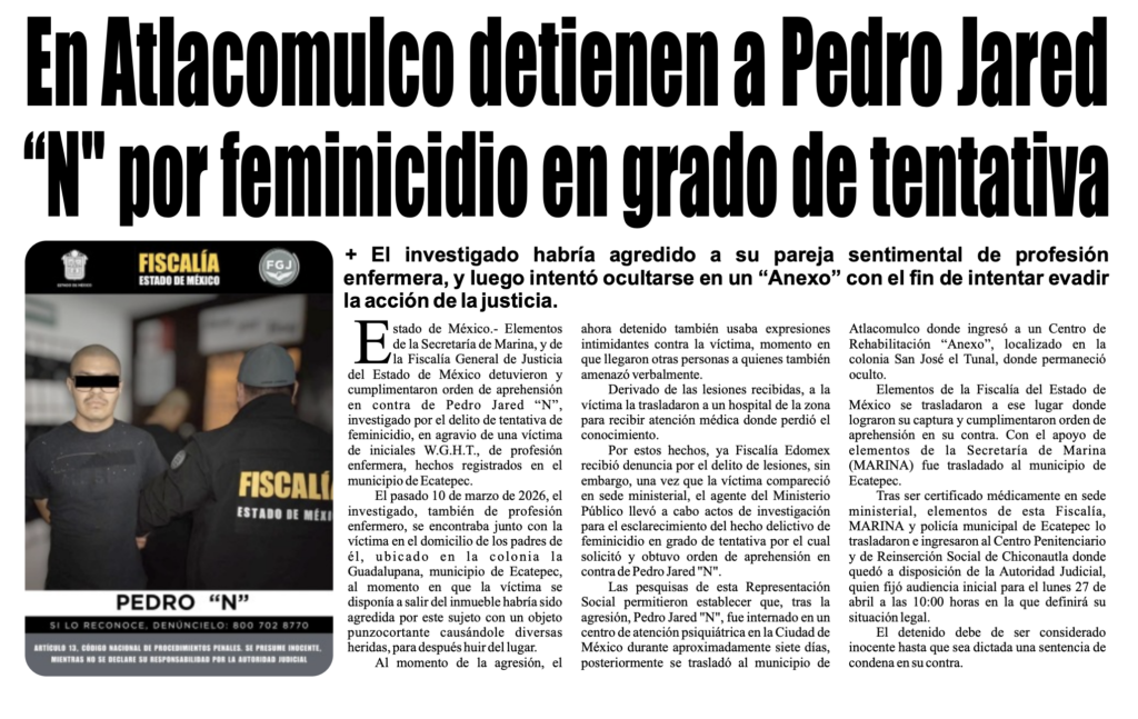 Elementos de la Policía Metropolitana de Ecatepec, la Fiscalía Mexiquense y Fuerza de Tarea Marina detuvieron a Pedro Jared ‘N’ de 23 años, en Atlacomulco, Estado de México, quien, bajo el influjo de estupefacientes, lesionó con arma blanca a su pareja en diversas partes del cuerpo en una vivienda del fraccionamiento La Guadalupana, en el municipio de Ecatepec, lo cual le provocó un estado de coma temporal.