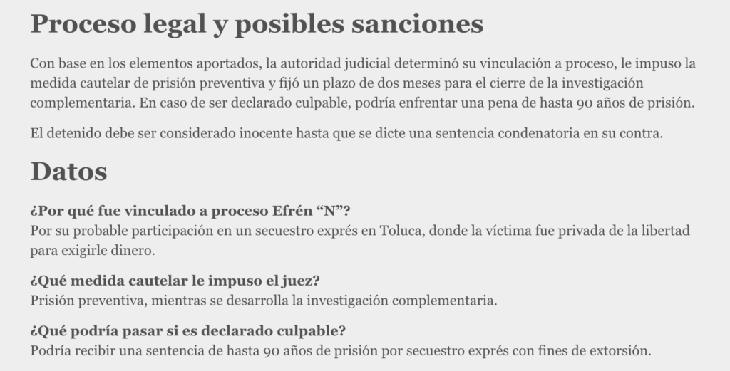Un Juez con sede en Toluca vinculó a proceso a Efrén “N”, por su probable participación en el delito de secuestro exprés con la finalidad de cometer extorsión, tras los datos de prueba presentados por la Fiscalía General de Justicia del Estado de México (FGJEM).
