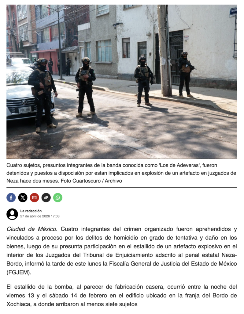 • https://www.jornada.com.mx/noticia/2026/04/27/estados/caen-4-integrantes-de-los-de-adeveras-implicados-en-explosion-de-artefacto-en-juzgados-de-neza