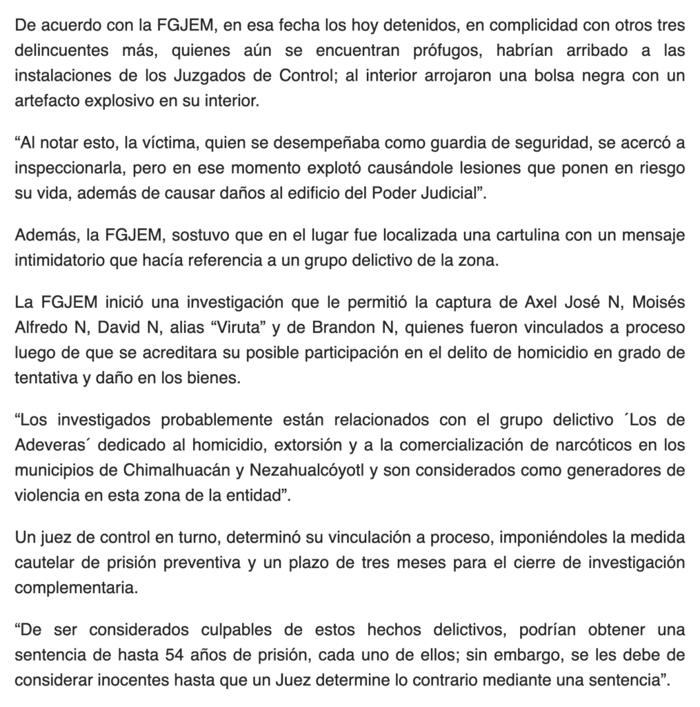 • https://www.capitaledomex.com.mx/local/los-de-adeveras-atacan-los-juzgados-en-neza-cuatro-sujetos-a-proceso-por-lanzar-artefacto-explosivo/