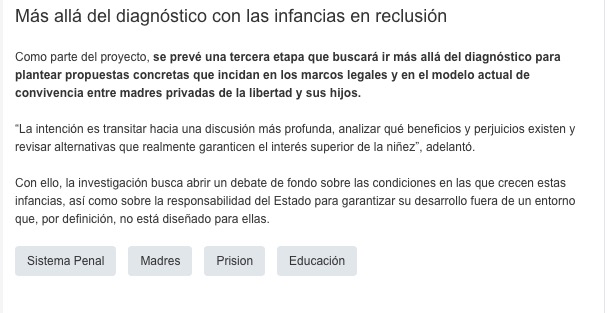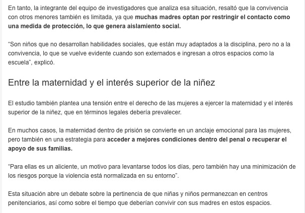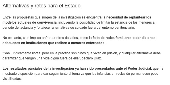 […] Los resultados parciales de la investigación ya han sido presentados ante el Poder Judicial, que ha mostrado disposición para dar seguimiento al tema ya que las infancias en reclusión permanecen poco visibilizadas.