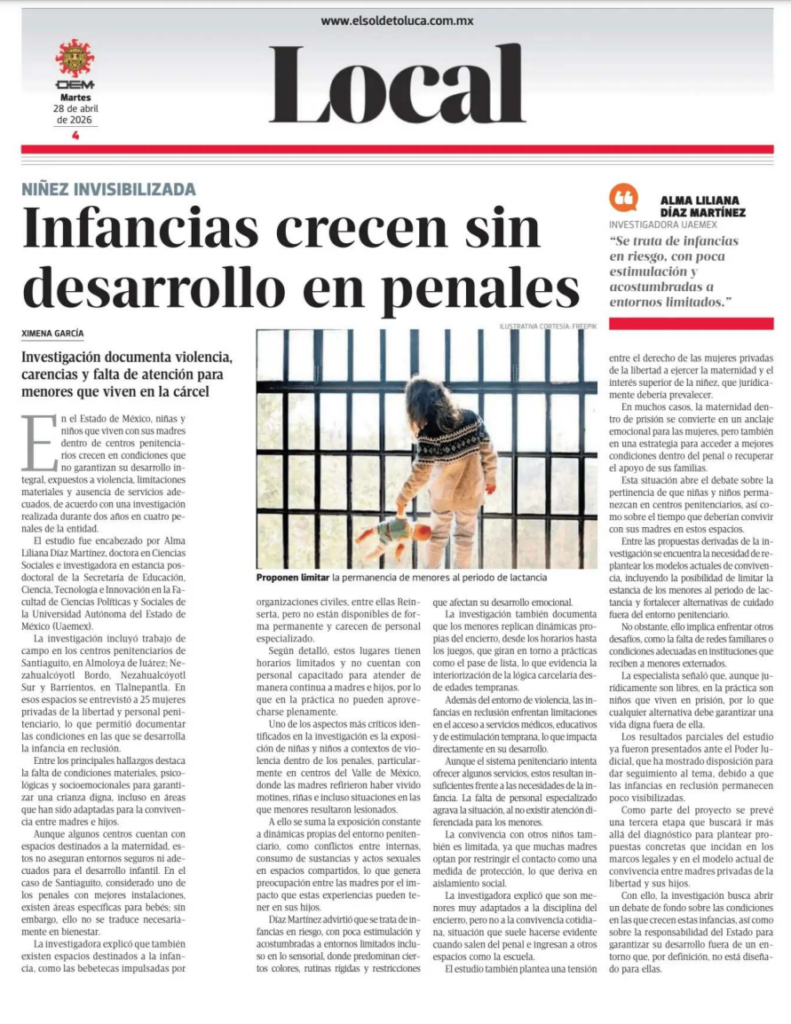 El estudio, encabezado por Alma Liliana Díaz Martínez, doctora en Ciencias Sociales e investigadora en estancia posdoctoral de la Secretaría de Educación, Ciencia, Tecnología e Innovación en la Facultad de Ciencias Políticas y Sociales de la Universidad Autónoma del Estado de México (UAEMéx), incluyó trabajo de campo en los centros penitenciarios de Santiaguito, en Almoloya de Juárez; Nezahualcóyotl Bordo, Nezahualcóyotl Sur y Barrientos, en Tlalnepantla, donde se entrevistó a 25 mujeres privadas de la libertad y personal penitenciario, lo que permitió documentar las condiciones en las que se desarrolla la infancia en reclusión.