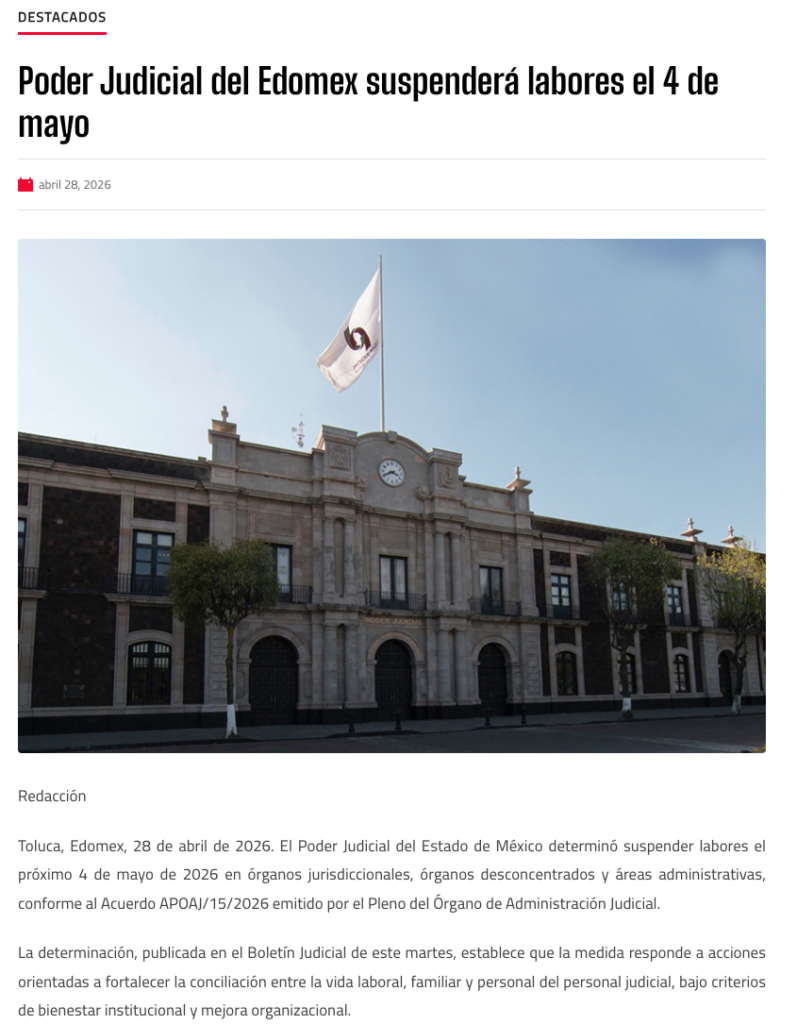 El Poder Judicial del Estado de México determinó suspender labores el próximo 4 de mayo de 2026, en órganos jurisdiccionales, órganos desconcentrados y área administrativas, conforme al Acuerdo APOAJ/15/2026 emitido por el Pleno del Órgano de Administración Judicial.