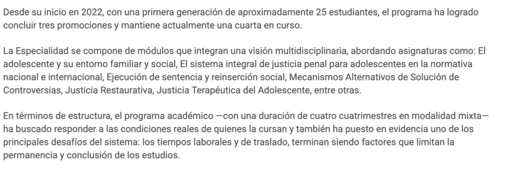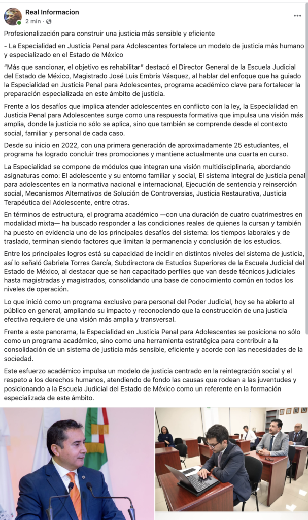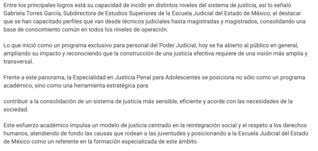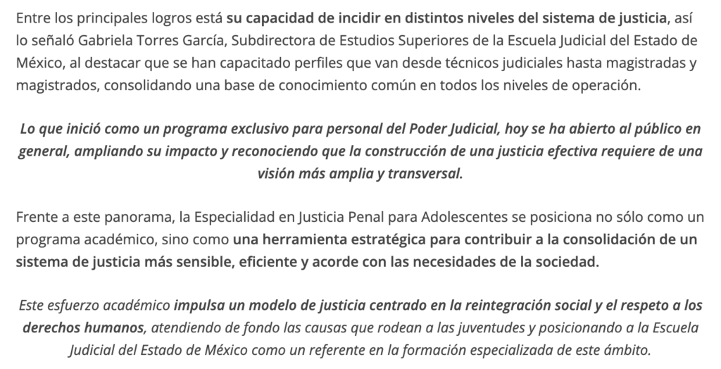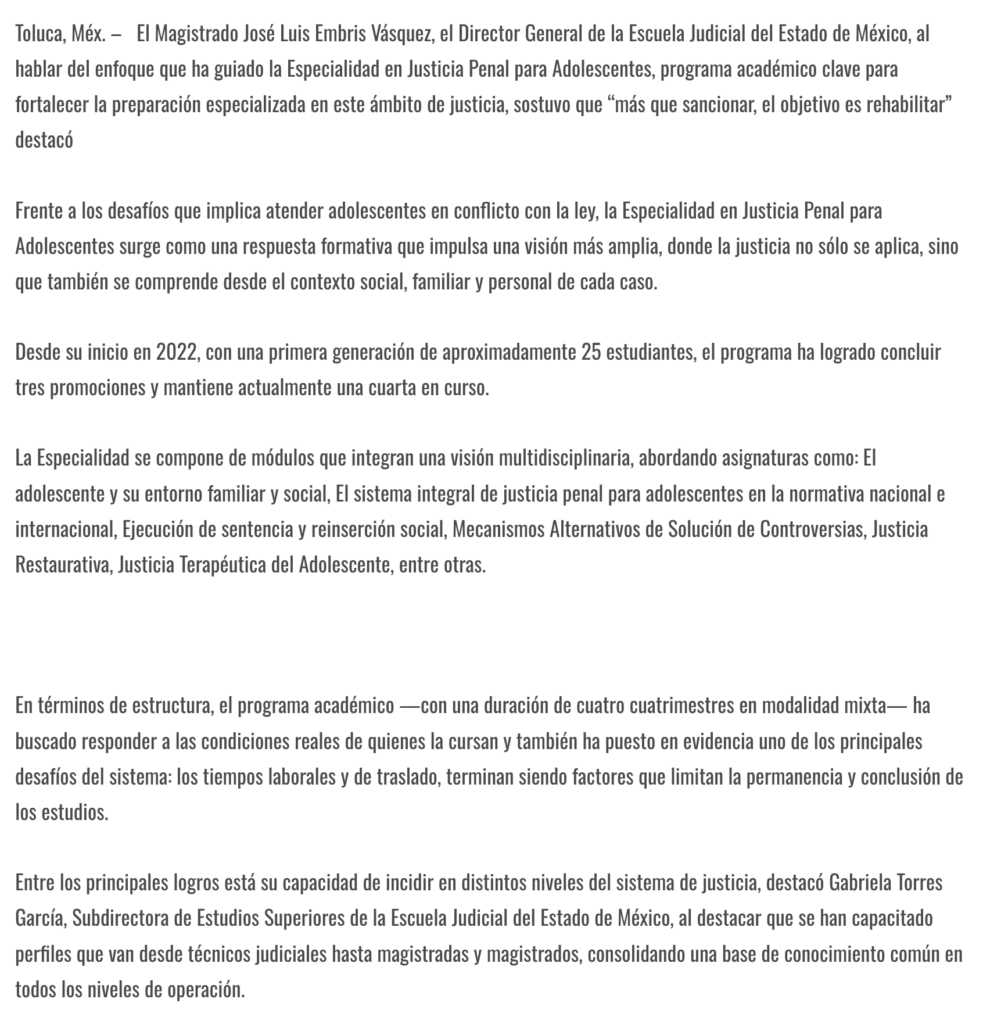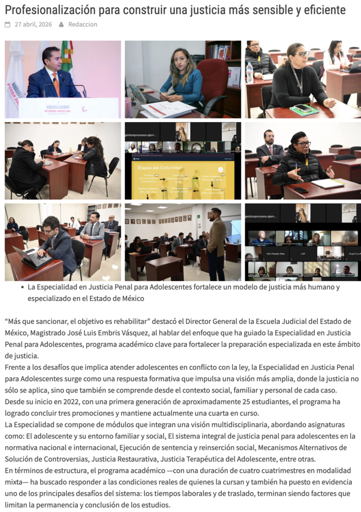 “Más que sancionar, el objetivo es rehabilitar” destacó el Director General de la Escuela Judicial del Estado de México, Magistrado José Luis Embris Vásquez, al hablar del enfoque que ha guiado la Especialidad en Justicia Penal para Adolescentes, programa académico clave para fortalecer la preparación especializada en este ámbito de justicia.