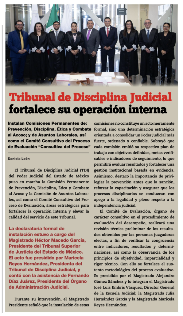 El Tribunal de Disciplina Judicial (TDJ) del Poder Judicial del Estado de México puso en marcha la Comisión Permanente de Prevención, Disciplina, Ética y Combate al Acoso y la Comisión de Asuntos Laborales, así como el Comité Consultivo del Proceso de Evaluación, áreas estratégicas para fortalecer la operación interna y elevar la calidad del servicio de este Tribunal.